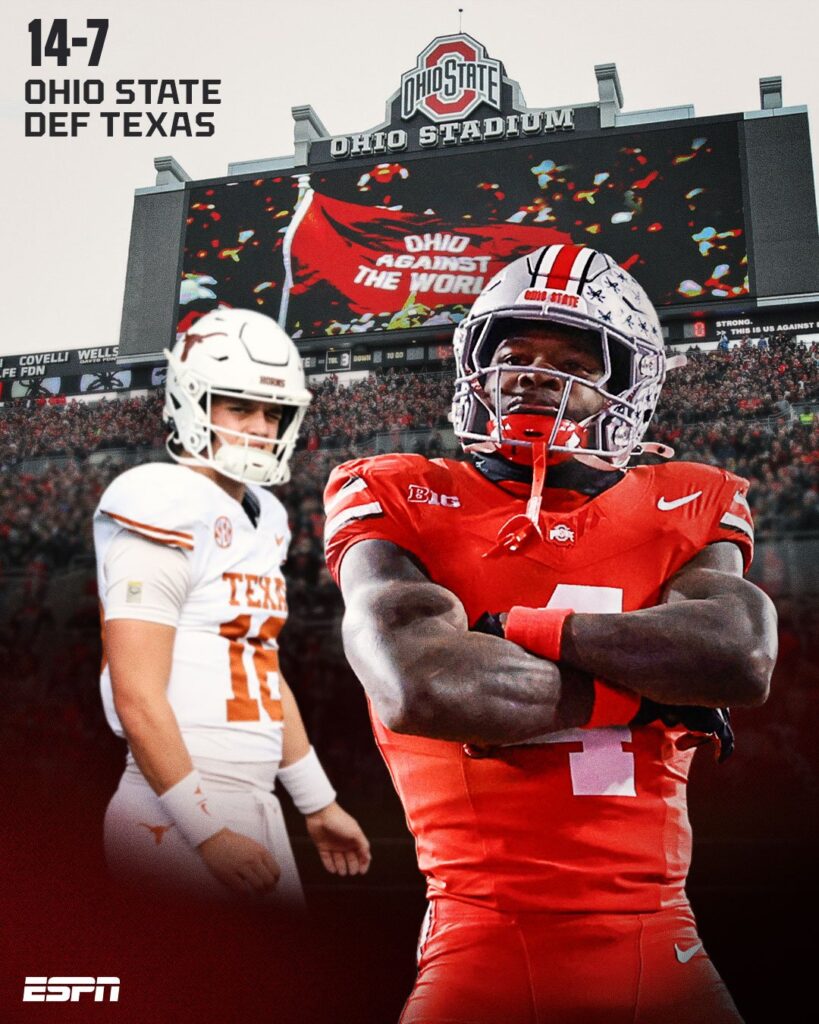 COLUMBUS, Ohio — The top-ranked Texas Longhorns fell 14–7 to the No. 3 Ohio State Buckeyes in a hard-fought season opener at Ohio Stadium. It was a statement win from Ohio State to begin their defense of the national title.